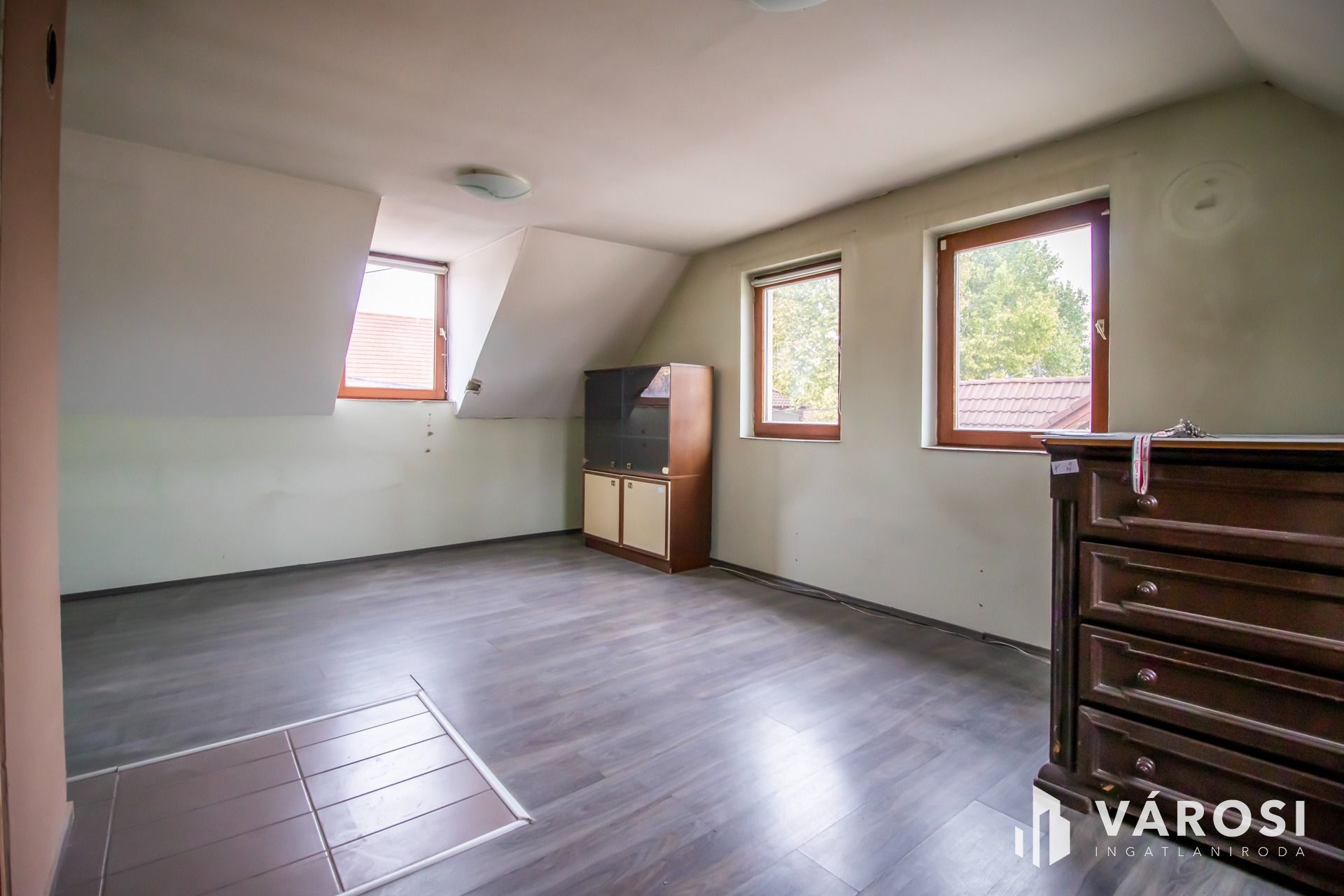 A tágas tetőtérben, további nappali, 3 napfényes szoba, 1 félszoba, konyha, fürdőszoba, wc helyezkedik el, 103 négyzetméteren.