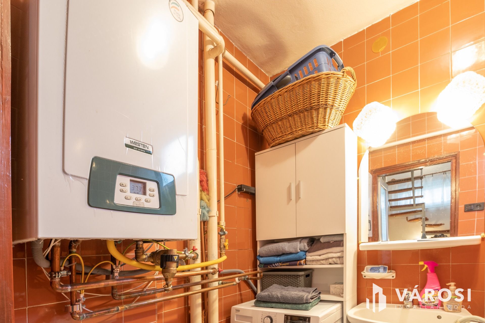 Kondenzációs gázkazán (radiátor) gondoskodik a fűtésről és a meleg vízről.