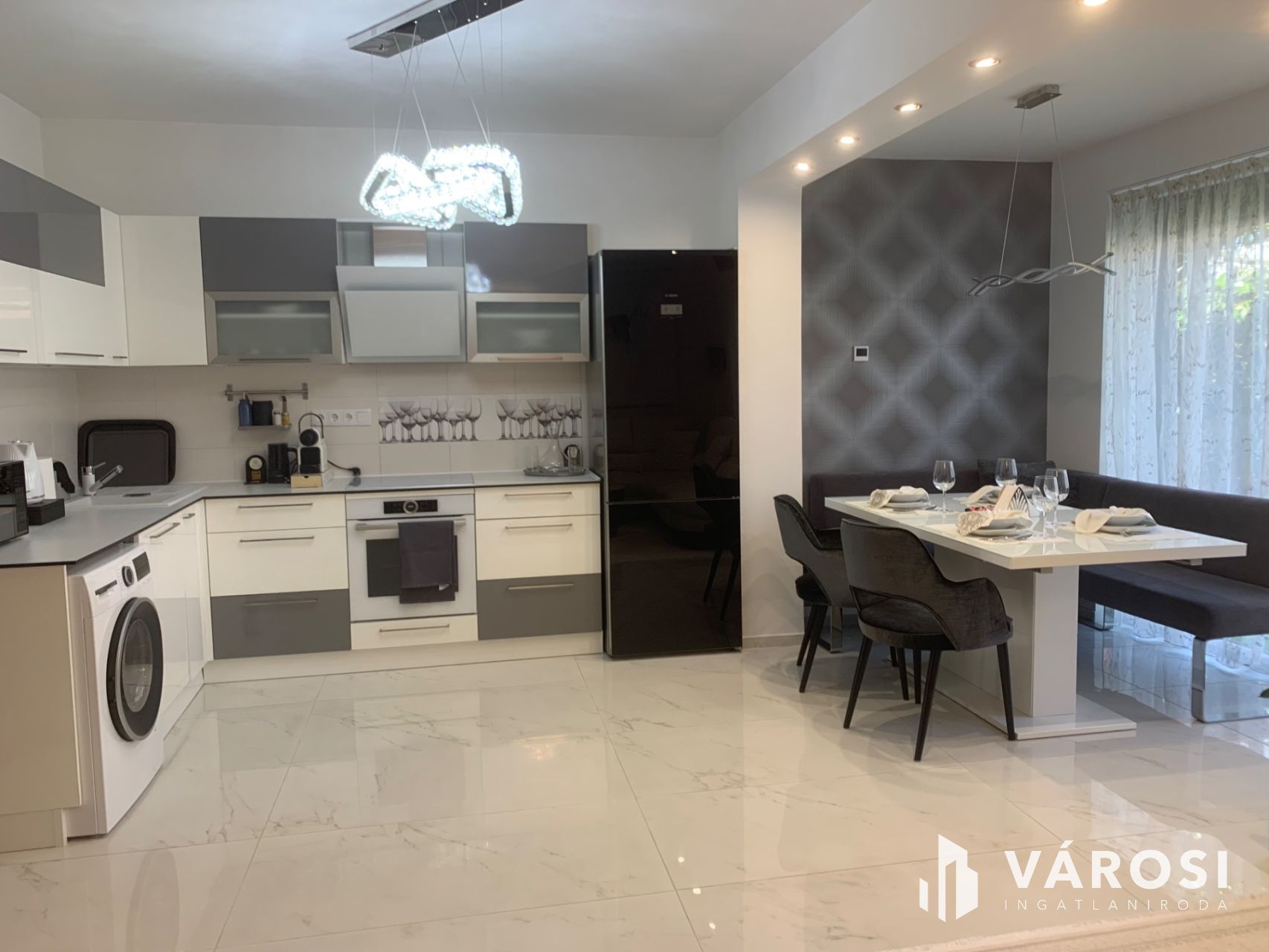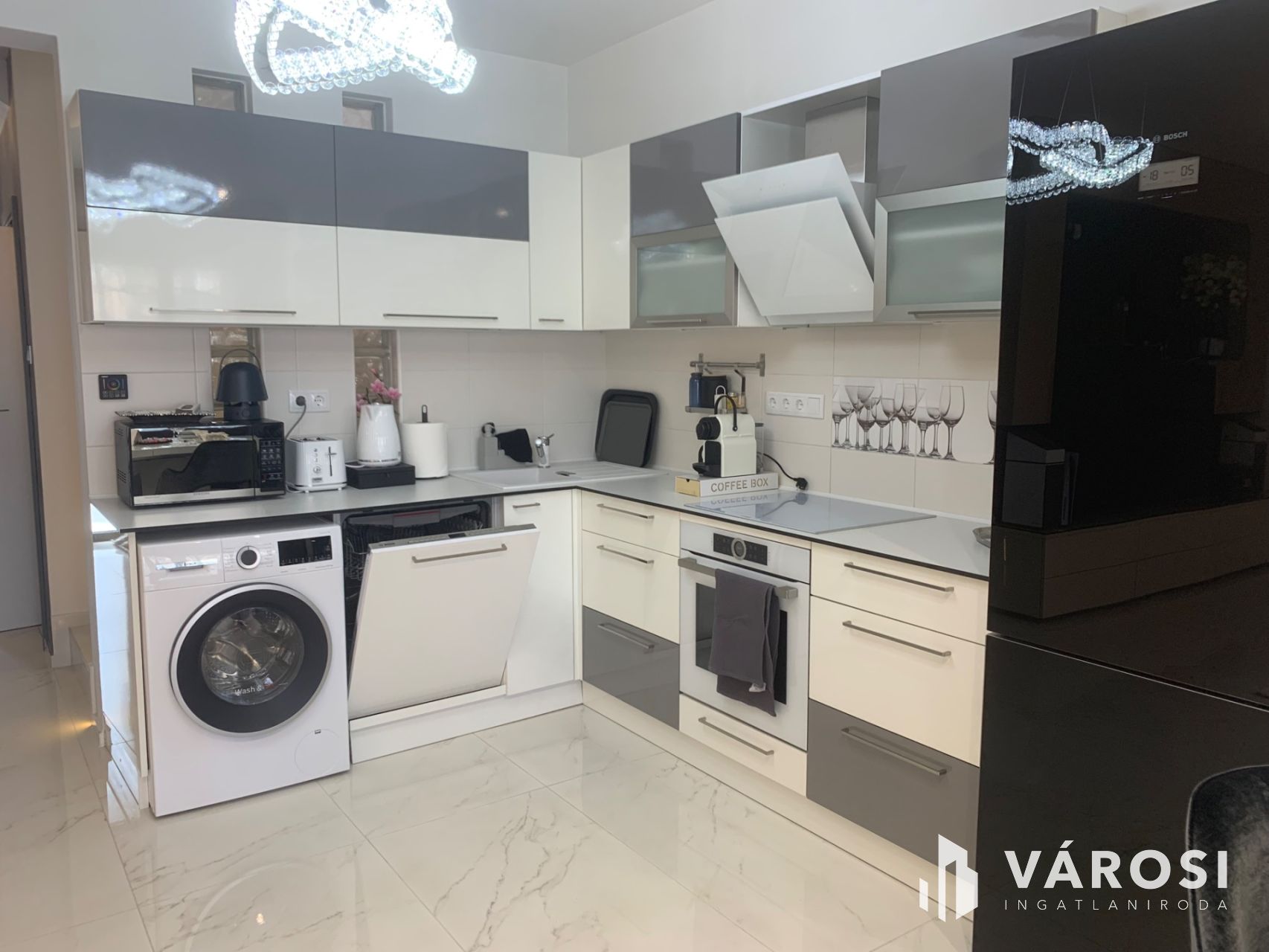 Konyha: Teljes körűen beépített, csúcskategóriás Bosch gépekkel felszerelt .