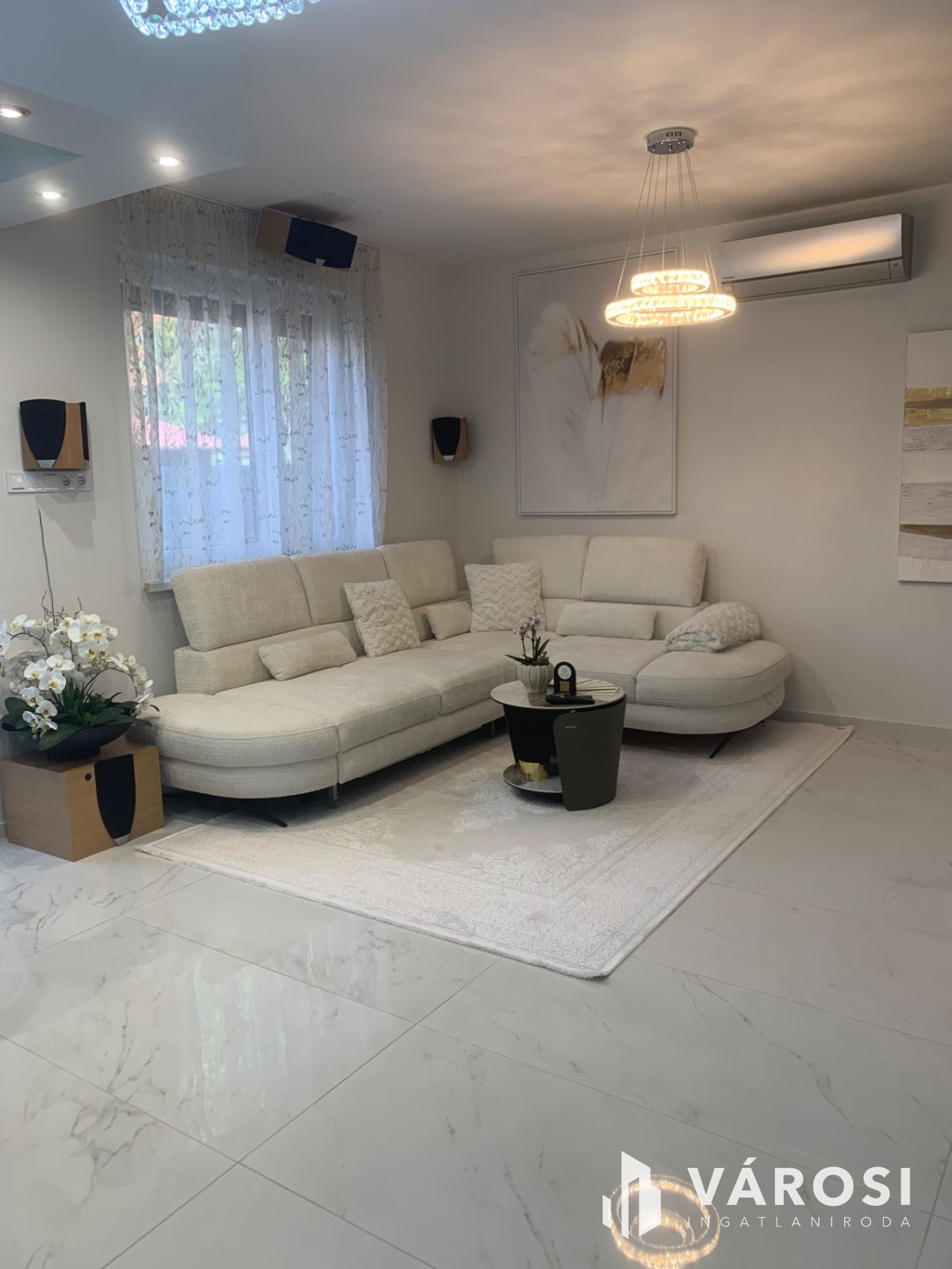 Nappali: Exkluzív olasz ülőgarnitúra, márvány dohányzóasztal, óriás LG okos TV, 5.1-es házimozi rendszer és PlayStation 5 konzol a prémium kikapcsolódásért.