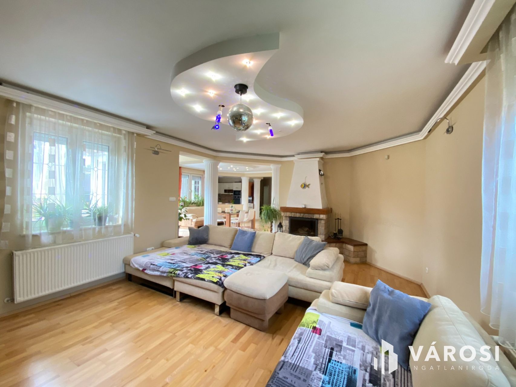 A ház központi része az amerikai konyhás nappali, amely méretéből adódóan valódi élettérként működik, ráadásul a kandalló még otthonosabb hangulatot ad. A földszinten négy külön nyíló szoba található, valamint két zuhanyzós fürdőszoba és egy infraszauna is helyet kapott, így akár nagyobb család vagy több generáció együttélése esetén is jól használható.